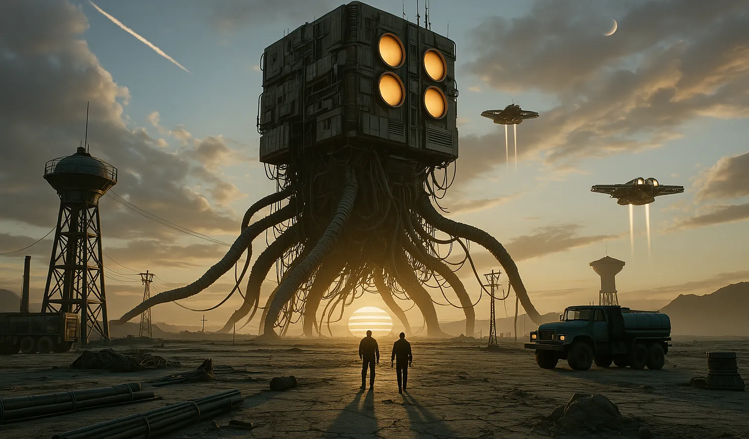 A huge robot with a sunset in a cinematic style